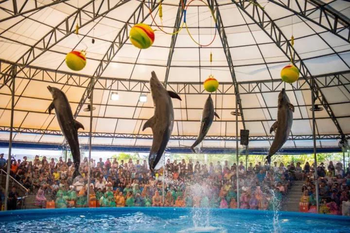 海豚是除了人類之外最聰明的動物了,它能夠和人類完美配合,完成各種精彩的表演。讓我們跟孩子一起欣賞近距離的海豚表演吧。