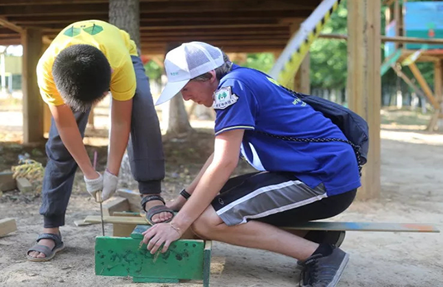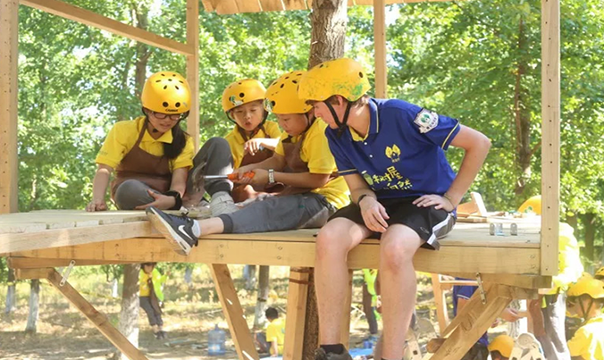 林間課堂:在認識建造工具、使用練習和安全課堂之后,馬上進入樹屋劇場搭建的第一階段了——制作登臺之梯