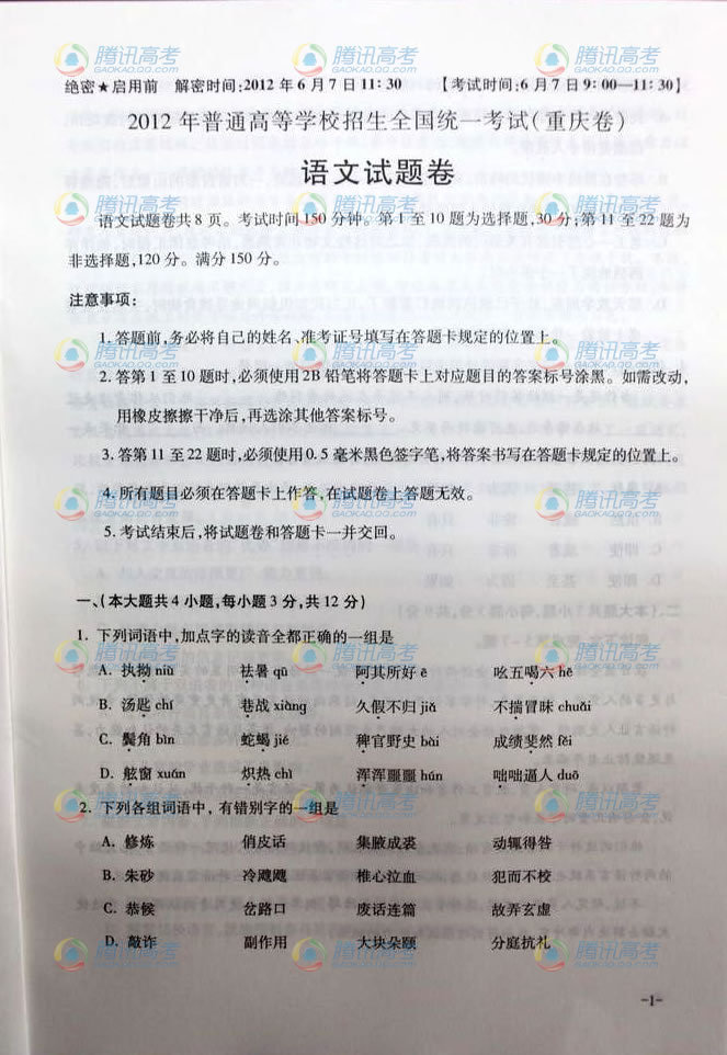 2012年重慶高考語文真題及答案公布