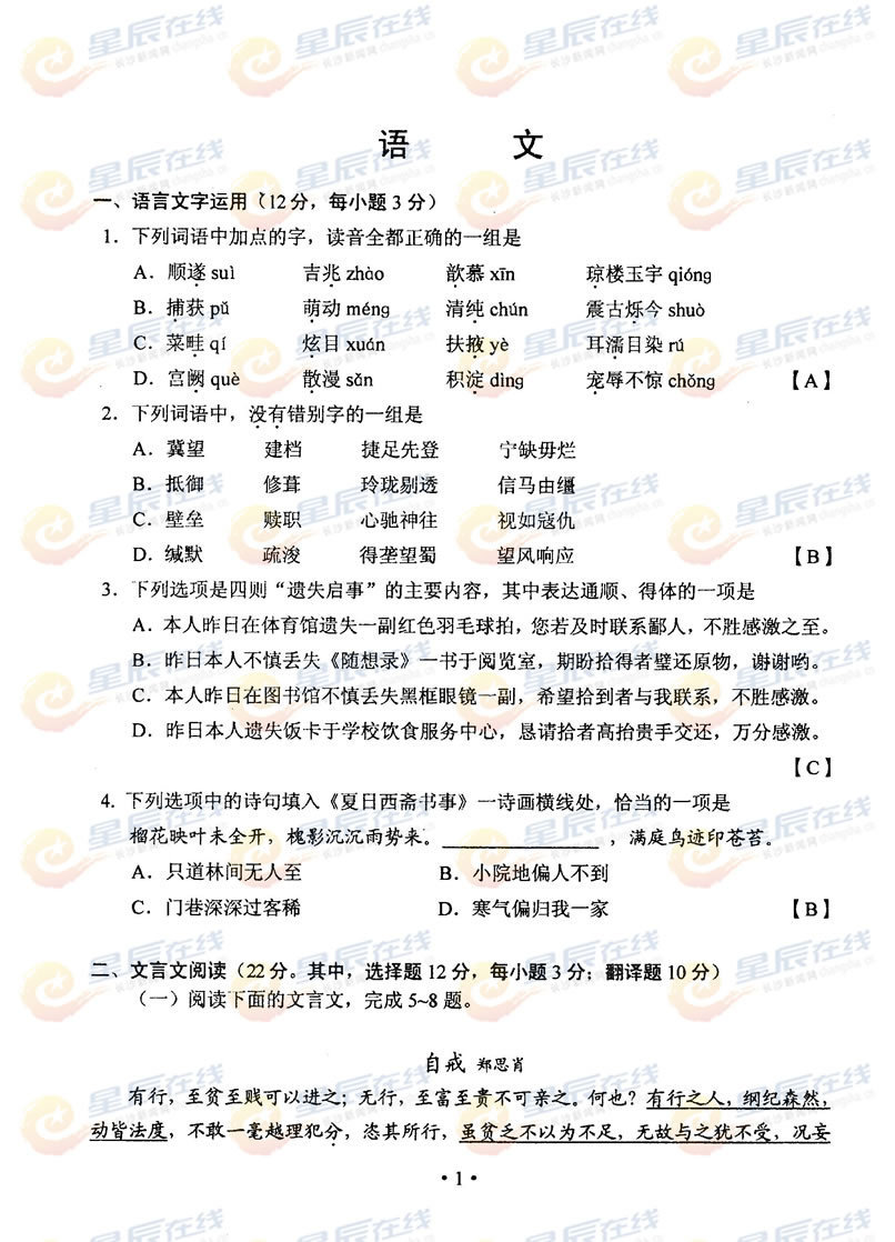 2012年湖南高考語文真題及答案公布