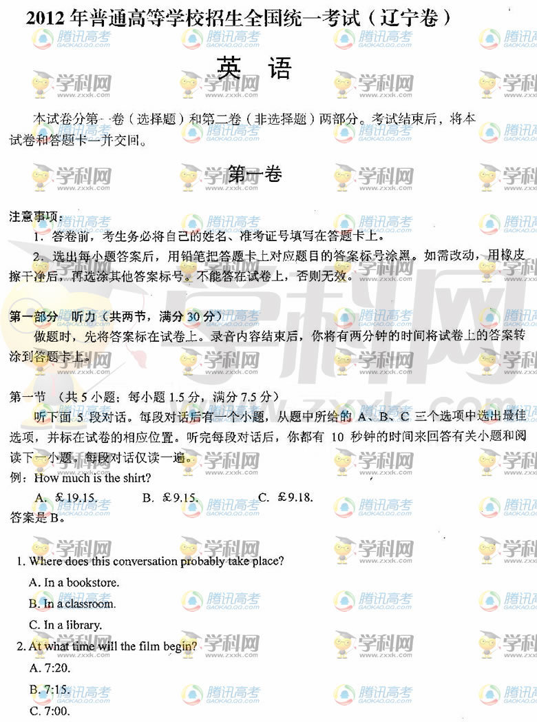 2012年遼寧高考英語真題及答案公布