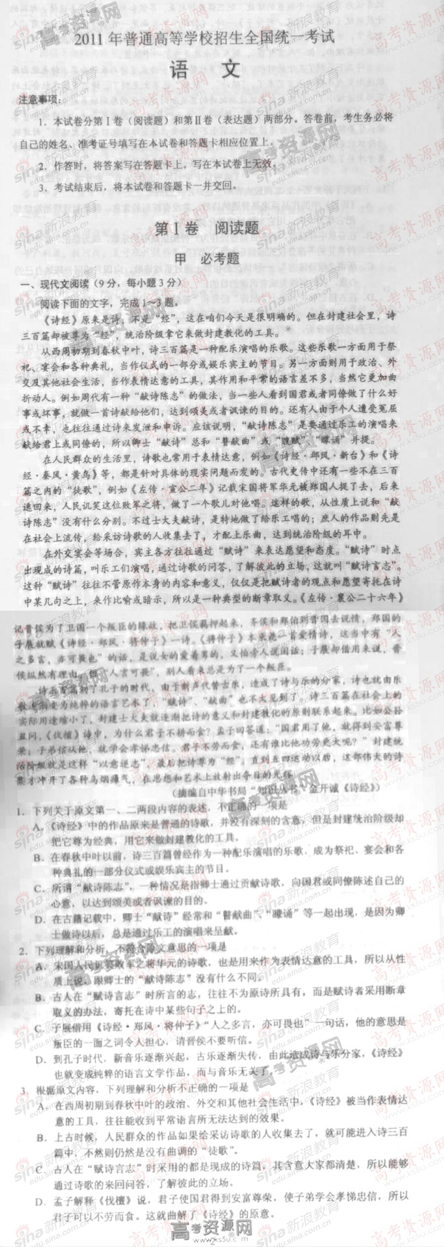 2012年高考新課標卷語文真題及答案公布(圖文)