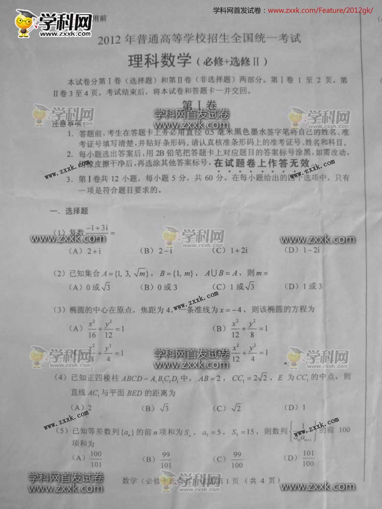 2012年高考全國卷數(shù)學(xué)(理)真題及答案