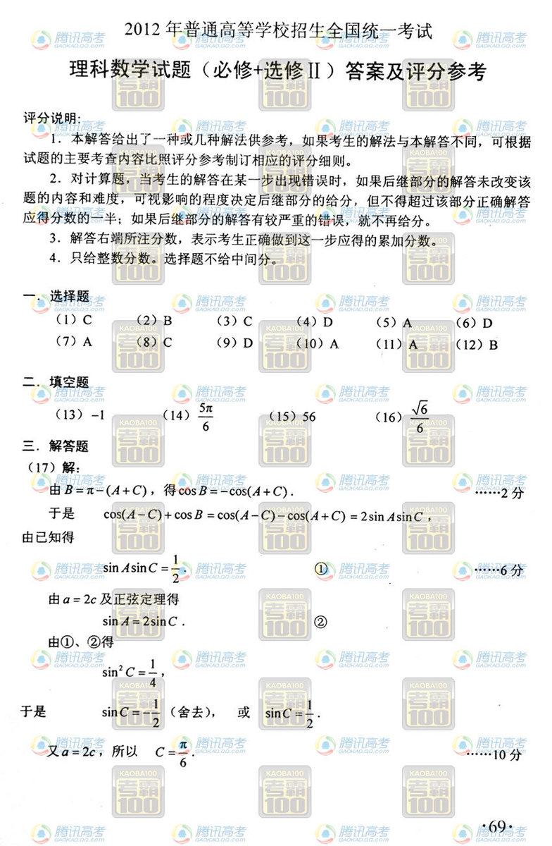 2012年高考全國卷數學(理)真題及答案(5)