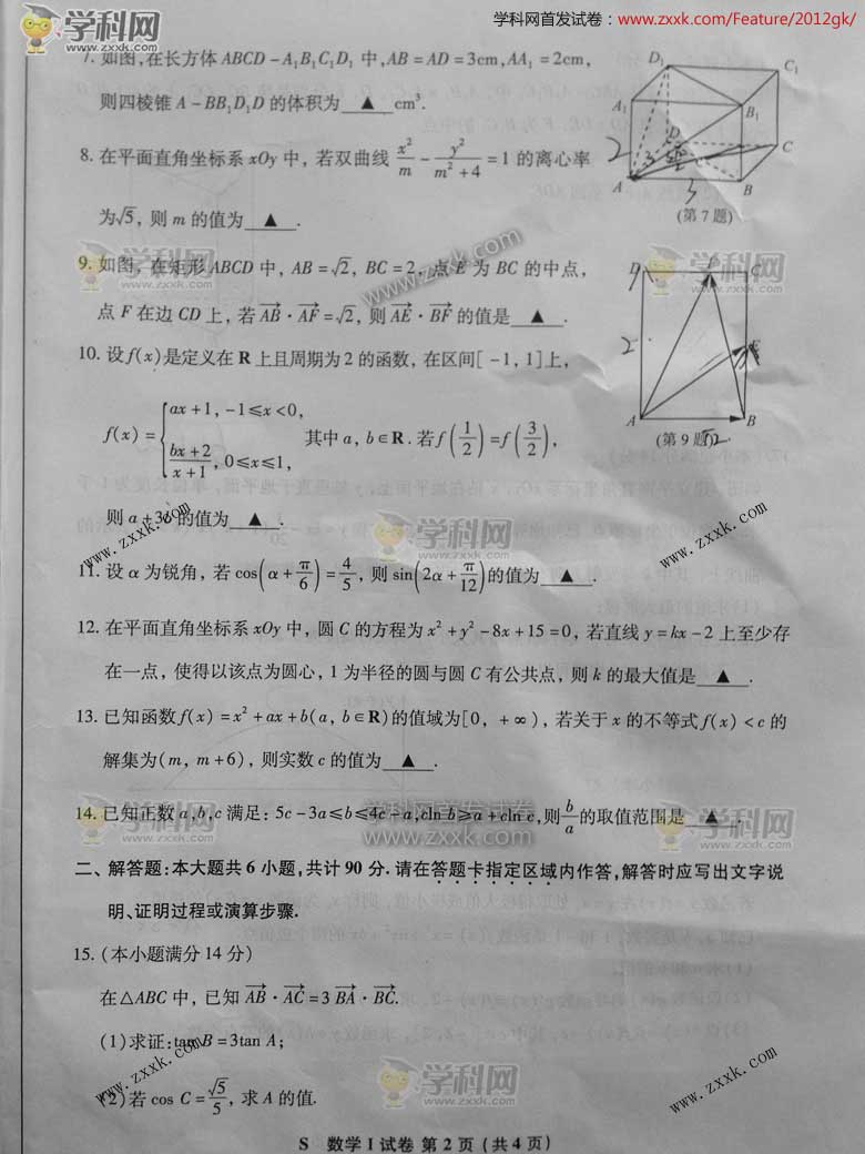 2012年江蘇高考數(shù)學(xué)真題及答案公布(2)