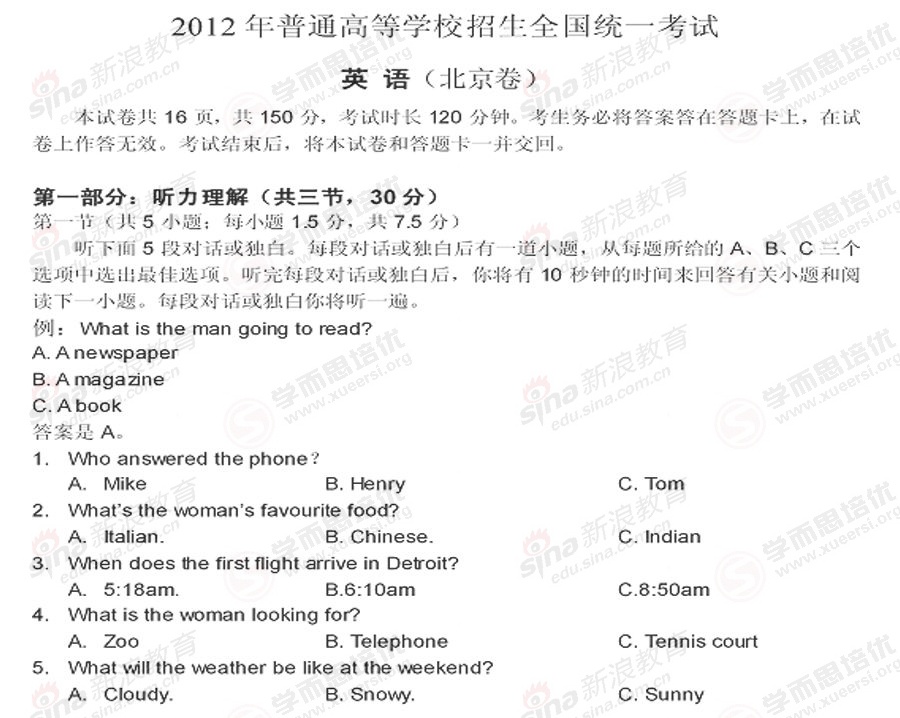 2012年高考英語真題及答案(北京卷)word版