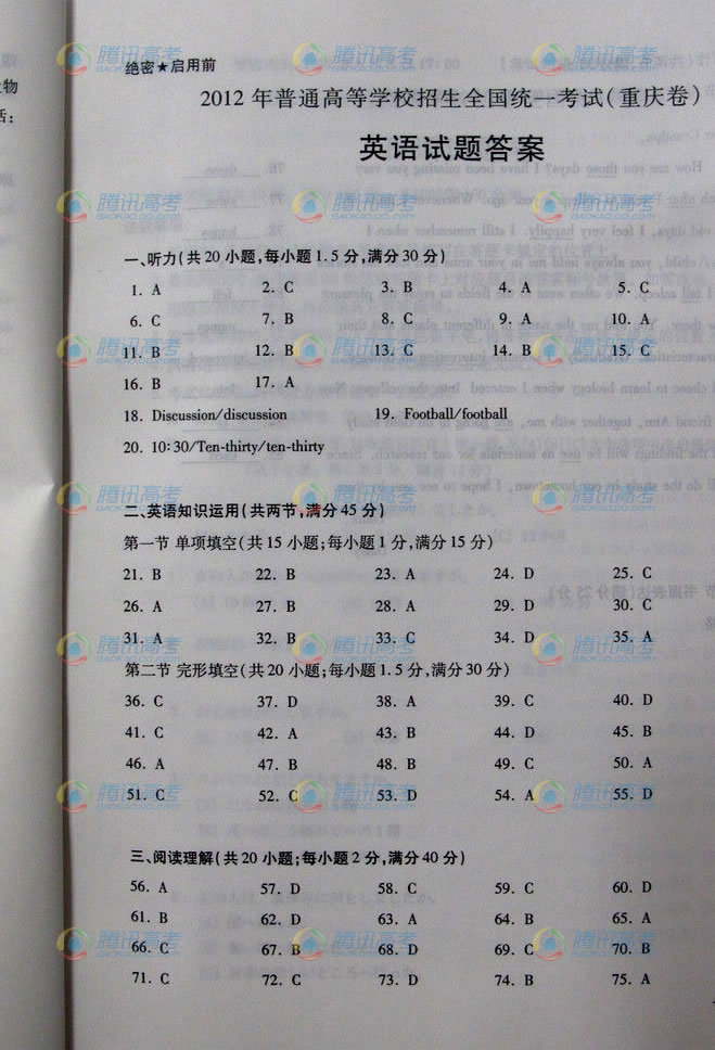 2012年高考英語真題參考答案(重慶卷)