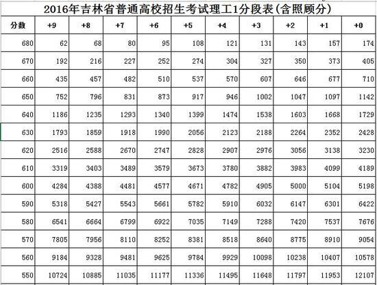 2016年吉林省普通高校招生考試理工類1分段表(含照顧分)已公布,具體如下: