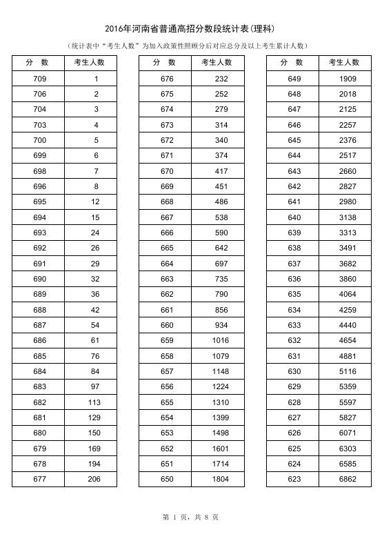 2016年河南高考成績一分一段表(理科)