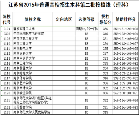 江蘇2016年普通高校招生本科第二批投檔線(文科)