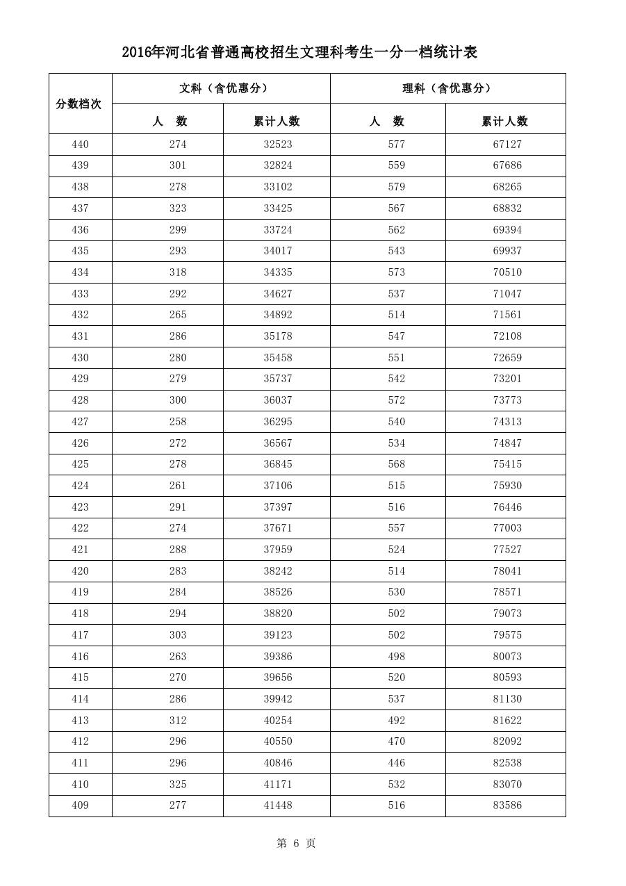 2016年河北高考文理科考生一分一檔統計表(6)