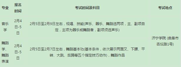 報考濟寧學院音樂學、舞蹈學、舞蹈表演專業的考生需參加濟寧學院專業考試且成績合格。報考濟寧學院音樂教育專業的考生需參加本科院校音樂學專業的專業考試且成績合格。