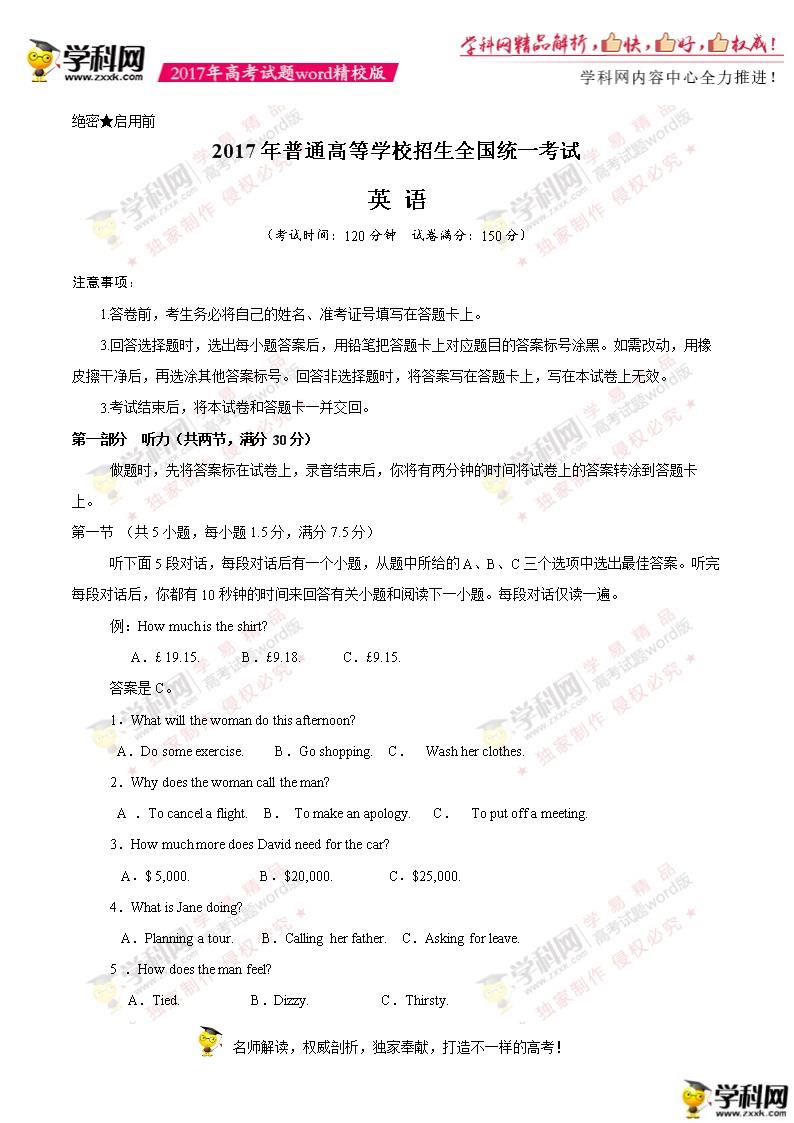 2017年全國卷3高考英語真題及答案由育路高考網考后首發,更多關于全國卷3高考答案、全國卷3高考試題等信息,請關注育路高考網或微信搜索“育路高考招生網”獲取。