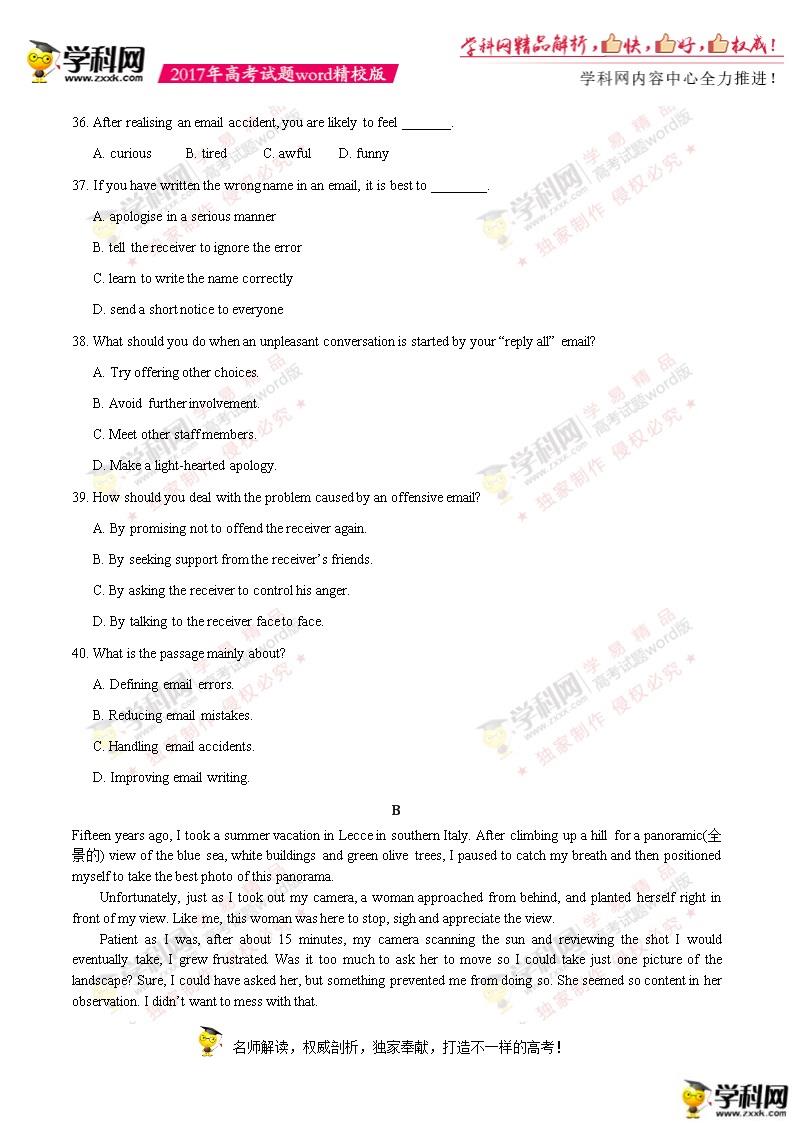 更多2017年天津高考英語真題及答案、天津高考英語答案、天津高考英語試題、高考志愿填報、高考成績查詢、高考分數線等信息,請及時關注育路高考網!