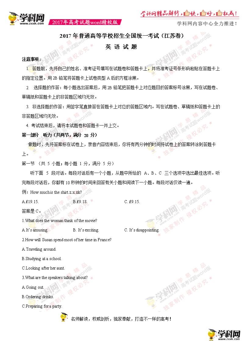 2017年江蘇高考英語真題及答案