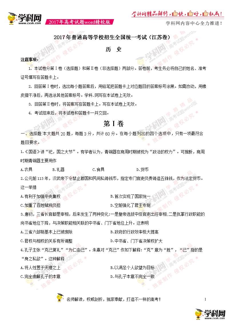 2017年江蘇高考歷史真題及答案