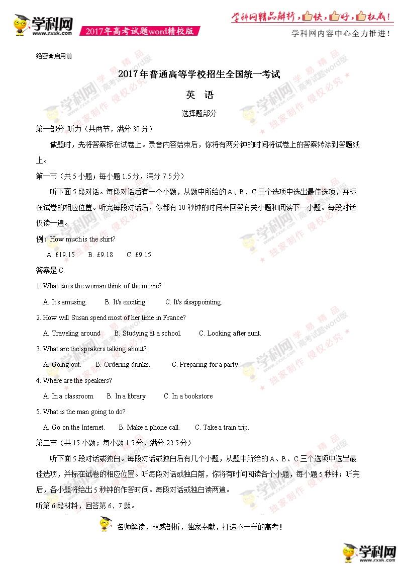 2017年浙江高考英語真題及答案