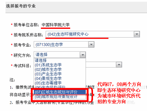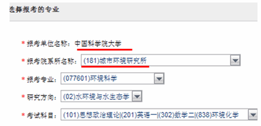 (1)報考城市環境所環境科學、環境工程、環境經濟與環境管理專業的考生請按此路徑填報信息:考生進入中國科學院大學招生信息網(http://admission.gucas.ac.cn/),招生單位所在省市選擇“北京”,招生單位欄中選擇“80001中國科學院大學”;在院系所名稱欄中選擇“(181)城市環境研究所”。報考頁面示例如下: