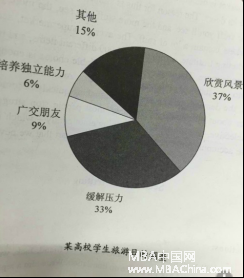 給出圖,表明影響旅游的因素。37%的人認為旅游可以欣賞風景;6%的人認為可以培養獨立能力;33%的人認 為可以緩解壓力;9%的人認為可以廣交朋友;還有15%的人認為有其他促使他們去旅游的因素。