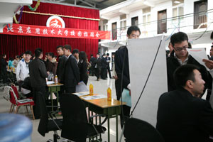 2008年10月31日,北京應(yīng)用技術(shù)大學(xué)學(xué)工部主辦的校園招聘會(huì)在二辦公區(qū)大廳內(nèi)火熱進(jìn)行。來自清華同方、Lenovo聯(lián)想、用友致遠(yuǎn)軟件、中國(guó)移動(dòng)、中科軟通、北京華電園信息技術(shù)有限公司、東方家園、宏圖三包、千龍網(wǎng)、勞動(dòng)協(xié)會(huì)研發(fā)中心、中國(guó)數(shù)碼、中國(guó)汽車人網(wǎng)傳媒公司、北京向?qū)r(shí)空科技公司、北京自由計(jì)調(diào)網(wǎng)、唐星生物科技公司等三十余家用人單位進(jìn)校招聘。北京應(yīng)用技術(shù)大學(xué)有800余人應(yīng)屆畢業(yè)生,參加了200多個(gè)職位的競(jìng)聘。