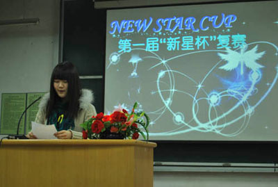 2008年12月4號晚上5點30在北大資源學院南210舉行了第一屆“新星杯”英語口語復賽。比賽開始時,由主持人介紹比賽規則,接下來是選手們一個接一個上臺進行英語演講。