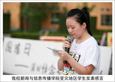 來(lái)自災(zāi)區(qū)的學(xué)生代表杜思祎同學(xué)發(fā)表感言說(shuō),她感謝國(guó)家和學(xué)校給予他們家鄉(xiāng)的幫助。 在活動(dòng)過(guò)程中,“汶川加油、四川加油、中國(guó)加油”現(xiàn)場(chǎng)的每個(gè)人都大聲喊出自己了的心聲。