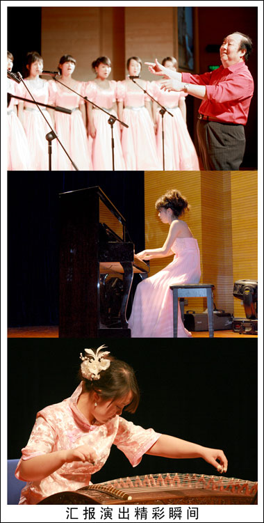 踏著三年來點點滴滴的生活照,吟唱著那熟悉的《明天會更好》,北京吉利大學06高職畢業生走上了舞臺,他們眼神中投射著憧憬與不舍,對著他們熟悉的面孔他們報上了自己姓名。在如雷般的掌聲中,一首由倪敏帶來的《共青團員之歌》拉開音樂會的帷幕,歌聲雄渾有力,振奮人心,接著蘆鸝莉的一首《秋川風雨夕》加之鋼琴和古箏伴奏,把黛玉的心路歷程呈現在全場的觀眾面前,古岳冬的古箏獨奏《臨安遺恨》把一段段豪情壯志和慈母妻兒的似水柔情演繹的淋淋盡致。音樂舞蹈學院院長馬駿英教授指揮班主任王薇老師和戴暢等合唱的《山楂樹》使音樂會達到了高潮,贏得了一陣陣熱烈的掌聲。在掌聲和吶喊聲中,北京吉利大學音樂舞蹈學院的李秀軍老師和趙軍輝老師的一首動人心弦的《美麗的神話》敲響了音樂會的尾聲。全場座無虛席,潮水般的掌聲和天籟之音交融相錯,在國際報告廳上空回旋縈繞,久不退息。