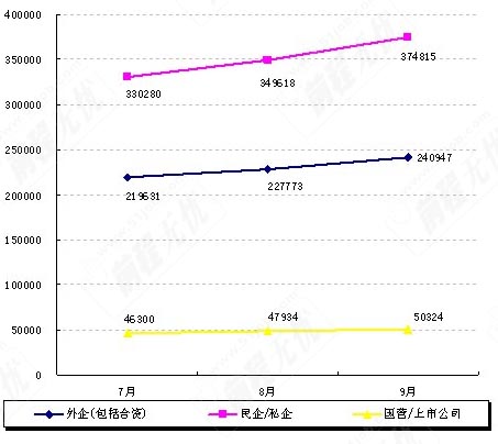 長假前后職場全線飄紅,上海與北京各占南北兩片要地,引領(lǐng)全國其他城市需求。企業(yè)需求中,一直支撐大局的民企,持續(xù)發(fā)力,保持老大的地位。9月無憂指數(shù)數(shù)據(jù)顯示,民企需求達(dá)374 815個(gè),9月與7月相比民企的需求數(shù)增長了44 000多個(gè)。同樣,年初一直保持低調(diào)的外企需求,也開始回暖,9月外企(包括獨(dú)資與合資)職位需求數(shù)達(dá)到了240 947個(gè),比7月增加了21 000多個(gè)職位。圖1為2009年第三季度(7月-9月)三大類企業(yè)職位需求走勢圖。