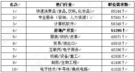 從第三季度(7月-9月)的行業(yè)招聘看,房地產(chǎn)開發(fā)人才需求上升很快。表1為9月需求排名前十位的行業(yè)。