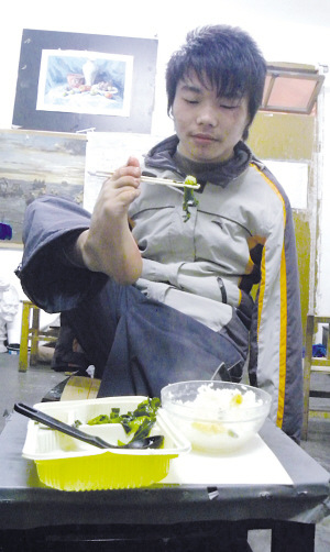 連日來,在南通大學文峰校區普通高校藝術類單招考場上,他在寒風中穿梭于各高校考場,已經參加了4所省外藝術院校的專業考試。他一蹦一跳中,空蕩蕩的袖管和褲筒在寒風中搖曳,總是引來無數人心酸的熱淚以及由衷的敬佩。