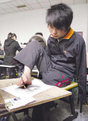 ![]() 考場上的劉凱健,用腳進行創作。 |