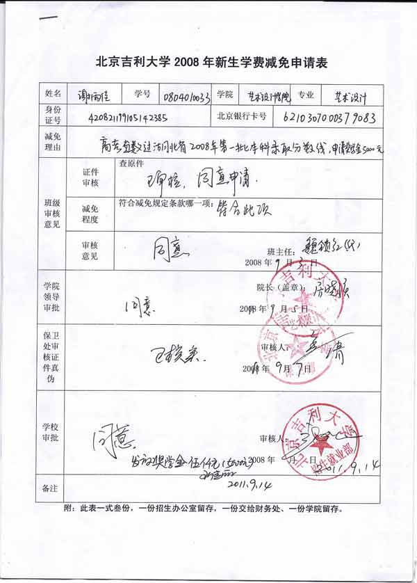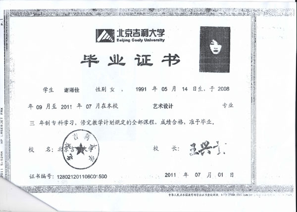 2008年,高考總分達(dá)到湖北省第一批本科錄取分?jǐn)?shù)線的謝雨佳同學(xué)放棄榮升一本重點(diǎn)大學(xué)的機(jī)會(huì),毅然報(bào)考北京吉利大學(xué)計(jì)劃內(nèi)藝術(shù)設(shè)計(jì)專業(yè),并被北京吉利大學(xué)現(xiàn)代藝術(shù)學(xué)院錄取。2011年,經(jīng)過(guò)三年對(duì)專業(yè)知識(shí)與專業(yè)技術(shù)的磨練,謝雨佳同學(xué)在北京吉利大學(xué)完成全部學(xué)業(yè)后,領(lǐng)走獎(jiǎng)學(xué)金5000元。