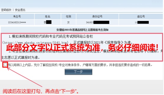 “下一步”按鈕:錄入完院校代碼和專業代碼后點擊進入志愿校對和確認頁面。