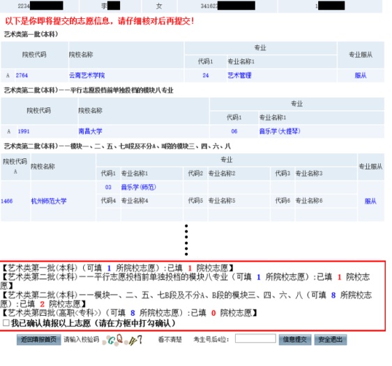 請考生務必再次仔細核對自己的信息,確認無誤后輸入校驗碼并點擊“信息提交”按鈕提交志愿信息,信息一旦提交將無法重填或修改,請慎重操作。