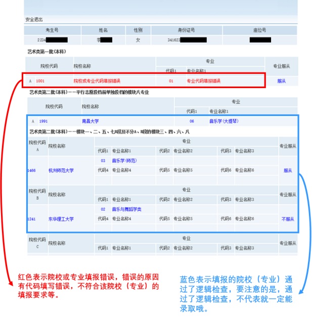 志愿信息經系統邏輯檢查,藍色字體表示通過檢查的院校名稱和專業名稱。紅色字體表示該院校志愿或專業志愿代碼填寫錯誤,或不不符合招生要求。