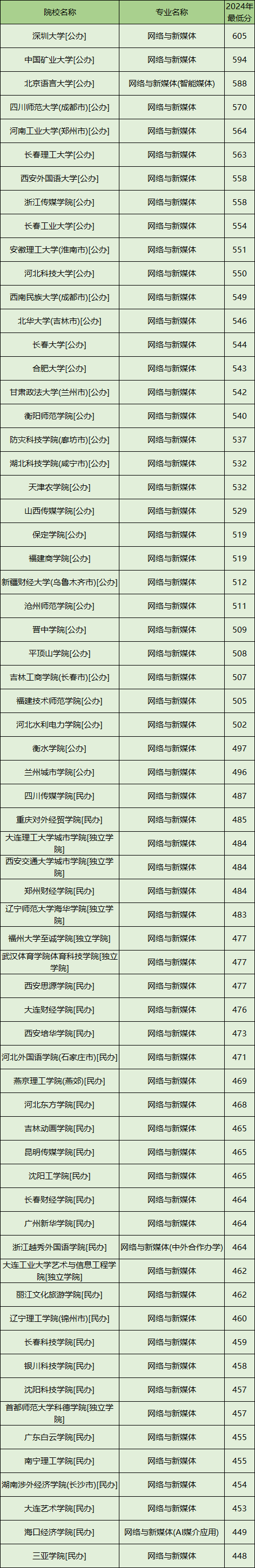河北2024年物理類錄取結果可知:網絡與新媒體專業收分最高的大學是深圳大學[公辦],需要605分。網絡與新媒體專業收分最低的本科大學是三亞學院[民辦],需要448分。