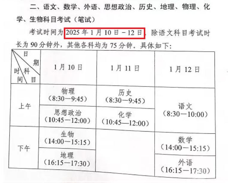 1月10日至12日,將集中進行語文、數學、英語、物理、歷史、政治、生物、地理等八門科目的考試。其中,鑒于語文試卷內容廣泛,其考試時間相對較長,設定為90分鐘;而數學、英語、物理、歷史等其余八門科目則統一為75分鐘。具體安排如下: