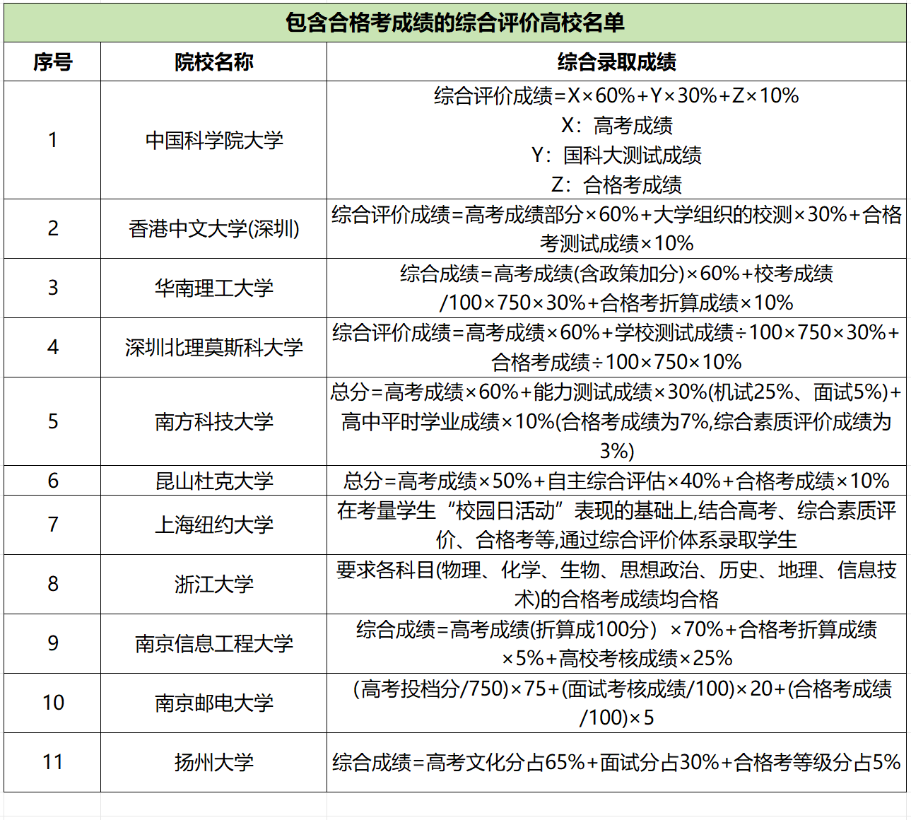 例如,中國科學院大學的綜合評價成績計算方式為:X=60%+Y×30%+Z×10%,其中的X代表高考成績,Y代表國科大測試成績,Z代表高中學業水平考試成績。昆山杜克大學的綜評總分是由50%的高考成績+40%的自主綜合評估成績+10%的高中學業水平考試成績構成的。