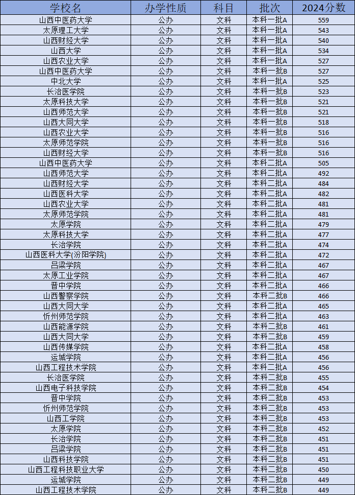 在2024年山西高考文科招生中,山西公辦本科大學的錄取分數線區間為449分至559分。錄取分數較高的學校包括:山西中醫藥大學最低分為559分,太原理工大學為543分,山西財經大學為540分,山西大學為534分,山西農業大學為527分。
