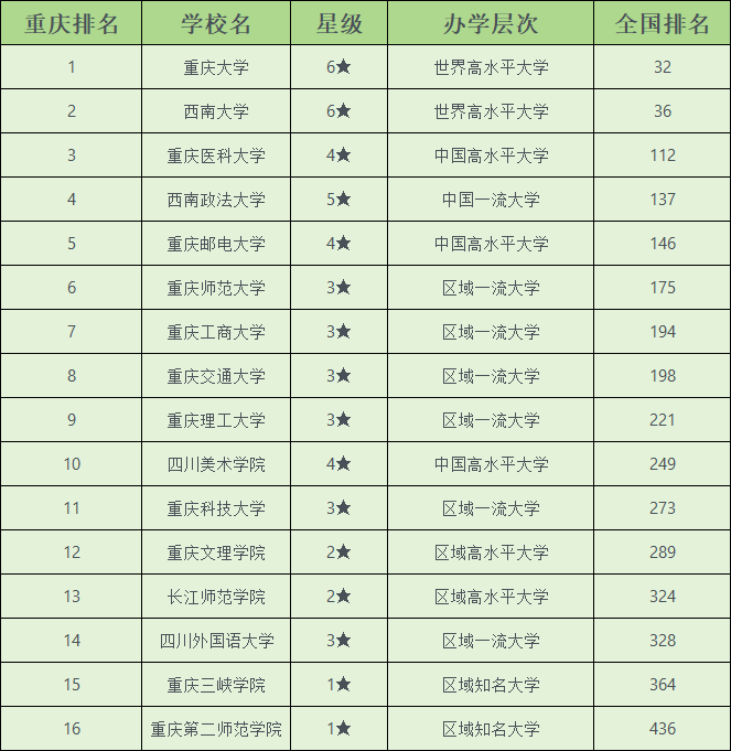 重慶大學位居重慶第一,獲評6星級,排名全國第32位,是“985工程”重點建設高校,屬于“世界高水平大學”。學校在工程學、建筑學、管理學等領域表現突出,科研和教學實力雄厚。