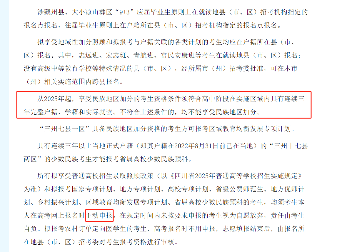 四川省對民族地區的考生給予了特別的加分照顧。但需要滿足一定條件:考生須在高中階段在實施區域內具有連續三年完整戶籍、學籍和實際就讀。