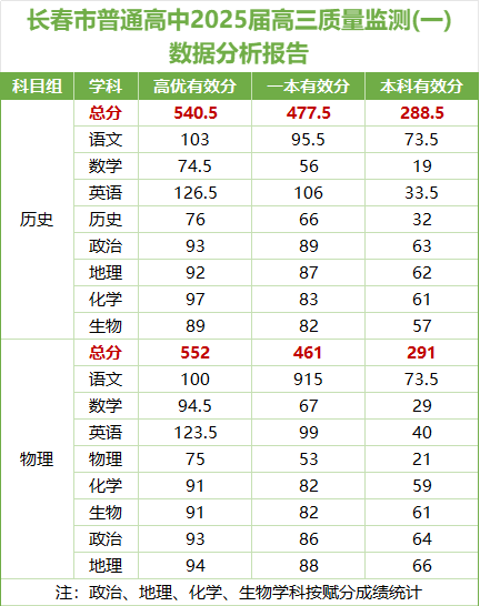 一、2025屆長春一模分?jǐn)?shù)線、各科有效分