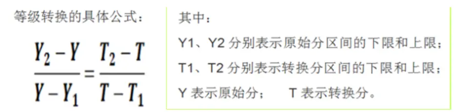 確定了賦分區間后,再根據等級換算公式計算出等級賦分后的分數,公式為: