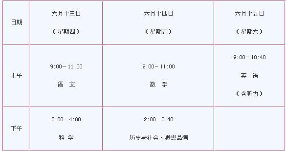 (一)考試科目、分值、時(shí)間:語(yǔ)文150分、數(shù)學(xué)150分、英語(yǔ)120分(含聽力考試25分)、科學(xué)200分、歷史與社會(huì)。思想品德100分、體育40分,總分760分。考試時(shí)間安排如下: