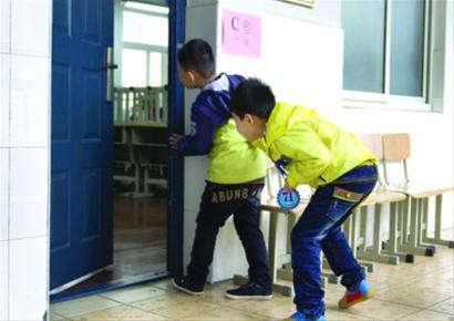 等候面試的小朋友在教室外“打探虛實”。目前不少城市擇校熱都集中在民辦私立學校
