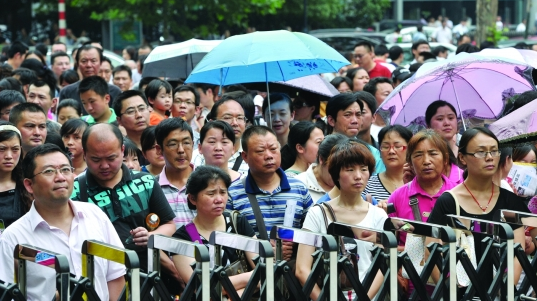 某外國語學校考場外,家長在焦急等待孩子以及考試結果。