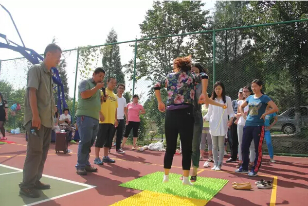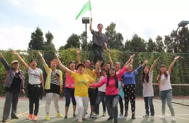 第二天,一場別具特色的野外拓展活動也在這里展開;顒訄鏊x在面臨山莊的一片籃球場地上,老師們的靈感像草坪上星星點點的小花,隨手采擷便是滿滿的一把。“太陽神隊”、“菁英隊”、“大圣隊”,個性的隊名、豪氣滿懷的口號、或俏皮或夸張的造型,引來陣陣歡笑,驚起樹叢里鳥兒高飛。在主持人專業(yè)的破冰熱身引導(dǎo)后,老師們摩拳擦掌,準(zhǔn)備為自己的團隊爭得高分。