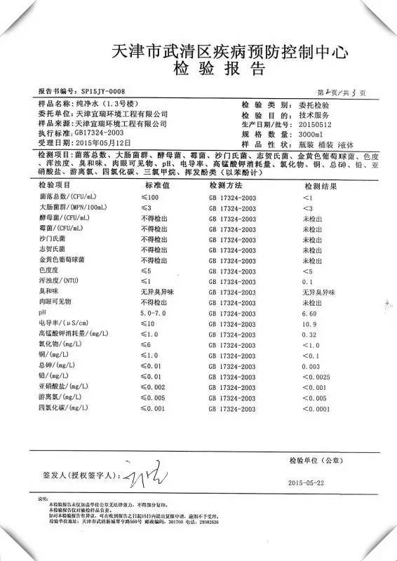 Water quality: On Sept.7th, Tianjin Yi Rui Environment Engineering Company inspected barreled drinking water, bottled water and Liquid pure water. The total bacterial count, coliform bacteria, yeasts, molds, turbidity, chloride,nitrite, chloroform, Volatile Phenols (phenol basis) and other 20 test items are in line with national testing standards GB 17324-2003. The water quality is excellent.