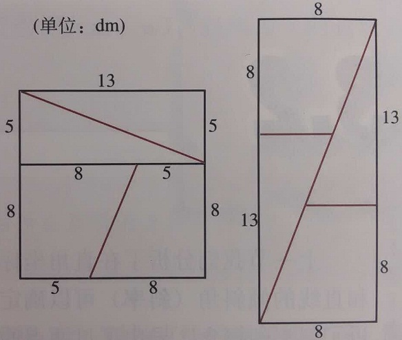 如開篇圖所示,我們用肉眼所觀察到的永遠是有限的,是片面的。看似只是表現形式不同的兩個“等大矩形”,實際上在操作之后的“矩形”對角線并不是一條直線。這是我們視覺的一種錯位作用,只有通過觀察,思考,運算等等,才能發現其中的奧秘。同樣的道理不僅可以運用在數學中,我們在生活中遇到的人和事均是如此,多觀察,勤思考,才能透過現象看本質。