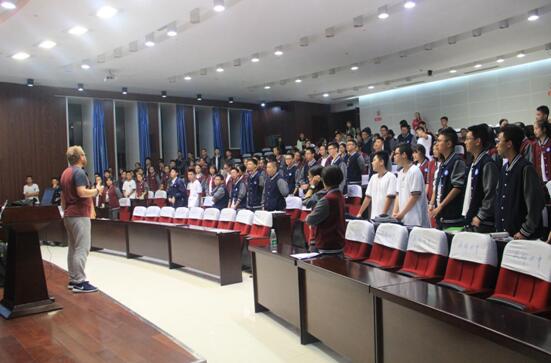 通過卡納斯與同學們一小段的互動之后,現場的熱情更高漲了,他隨機邀請Herry同學上臺與他一起搭擋,瞬間,一場即興的小型演奏會就呈現在大家面前了。不過,卡納斯選擇幕后指導,Herry臺前指揮,兩人默契的配合,與同學們頻繁的互動,所有的同學更加“噪”了,再現壯觀的百余人和聲演奏。